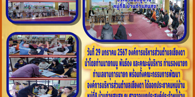 Posted in จดหมายข่าวประชาสัมพันธ์ วันที่ 29 มกราคม 2567 องค์การบริหารส่วนตำบลเชียงดา นำโดยท่านนายกมนู พันธ์ดง และคณะผู้บริหาร ท่านรองนายก ท่านเลขานุการนายก พร้อมทั้งคณะกรรมการพัฒนาองค์การบริหารส่วนตำบลเชียงดา ได้ออกประชาคมหมู่บ้าน หมู่ที่8 บ้านท่าแสนสุข ณ ศาลาอเนกประสงค์ประจำหมู่บ้าน วัดโพธิ์ศรีสว่าง Admin