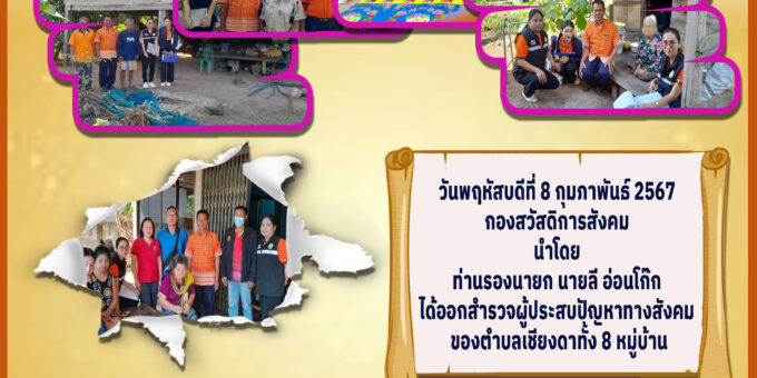 Posted in จดหมายข่าวประชาสัมพันธ์ วันพฤหัสบดีที่ 8 กุมภาพันธ์ 2567 กองสวัสดิการสังคม นำโดย ท่านรองนายก นายลี อ่อนโก๊ก ได้ออกสำรวจผู้ประสบปัญหาทางสังคม ของตำบลเชียงดาทั้ง 8 หมู่บ้าน Admin