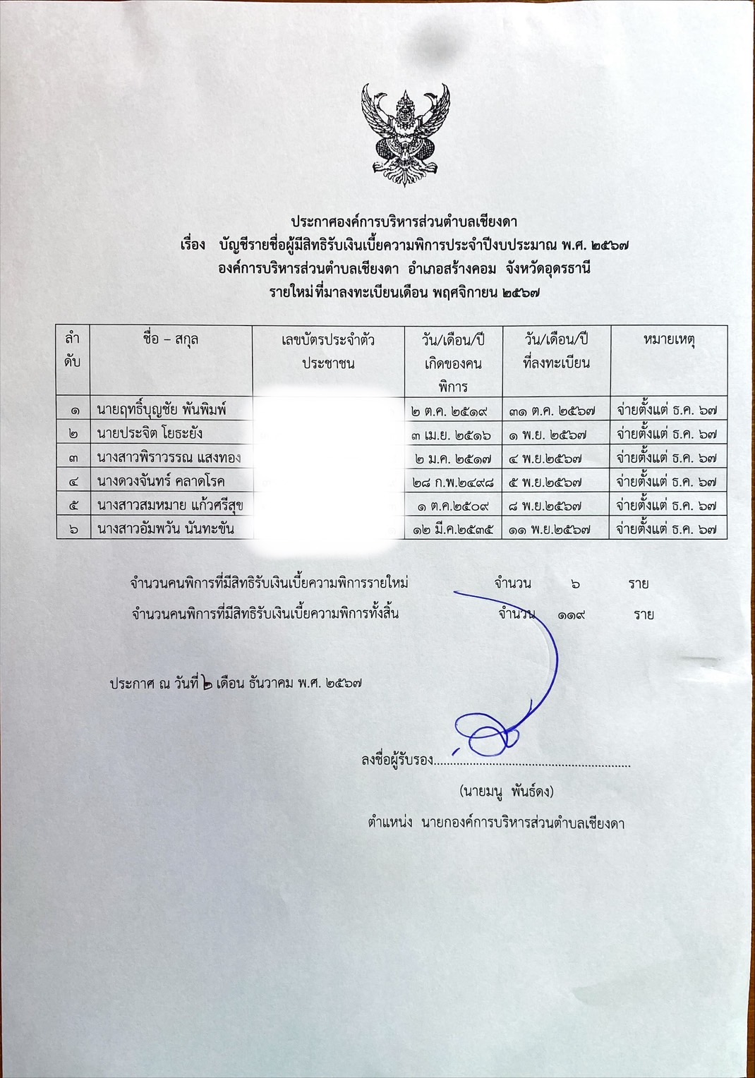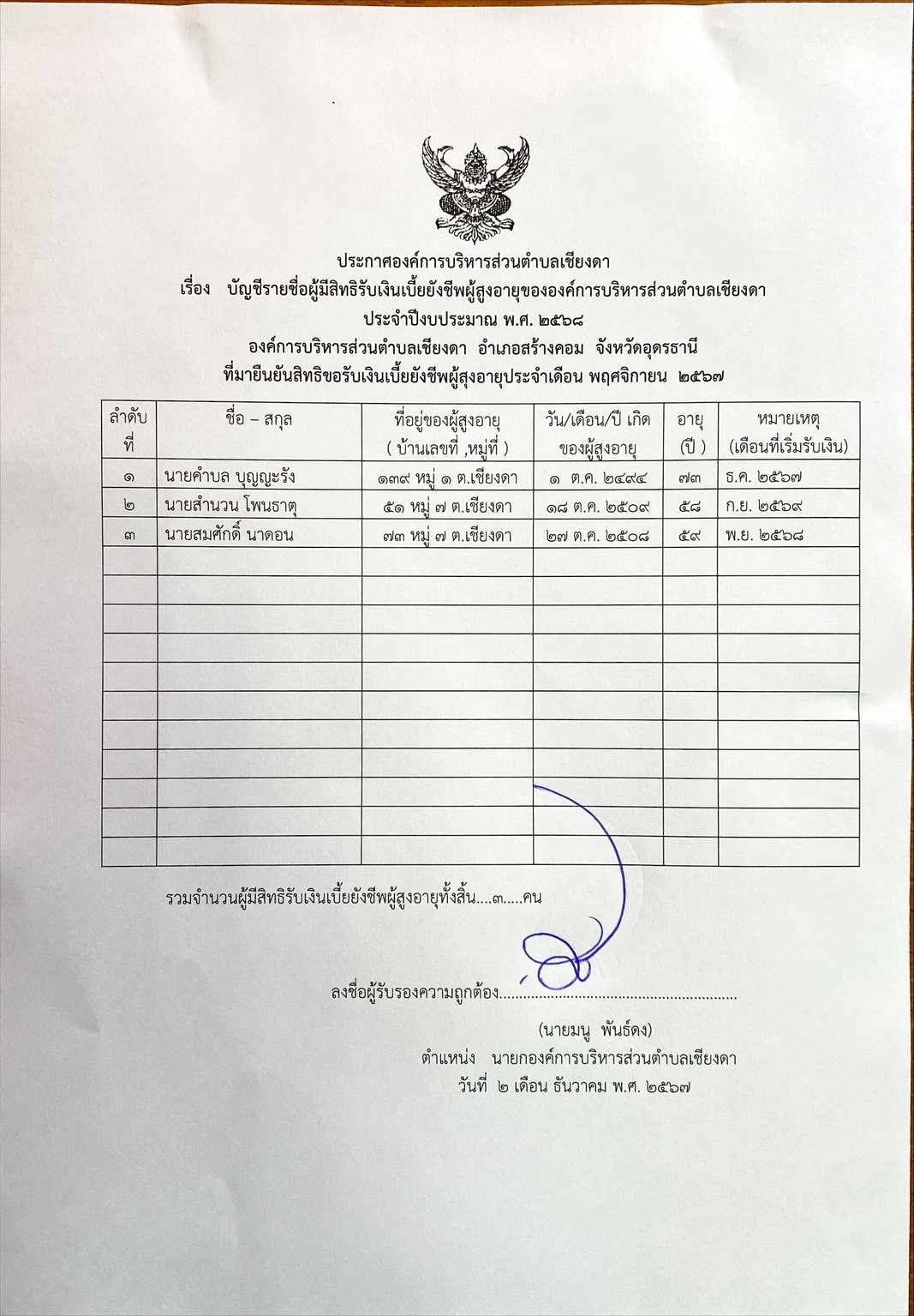 Posted in เบี้ยยังชีพ ผู้สูงอายุ ผู้พิการ ฯลฯ บัญชีรายชื่อผู้มีสิทธิรับเงินเบี้ยยังชีพผู้สูงอายุและผู้พิการขององค์การบริหารส่วนตำบลเชียงดา ประจำปีงบประมาณ พ.ศ.2567 ที่มาลงทะเบียนประจำเดือนพฤศจิกายน Admin