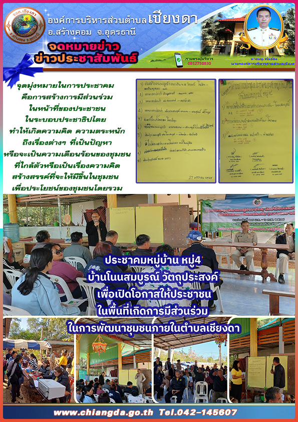 Posted in จดหมายข่าวประชาสัมพันธ์ วันที่ 27 มกราคม 2568 องค์การบริหารส่วนตำบลเชียงดา นำโดยท่านนายกมนู พันธ์ดง และคณะผู้บริหาร ท่านรองนายก ท่านเลขานุการนายก พร้อมทั้งคณะกรรมการพัฒนาองค์การบริหารส่วนตำบลเชียงดา ได้ออกประชาคมหมู่บ้าน หมู่ที่4 บ้านโนนสมบูรณ์ ณ ศาลาอเนกประสงค์ประจำหมู่บ้าน วัดพรสวรรค์ Admin