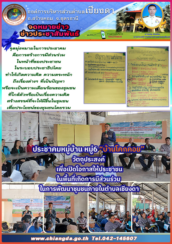 Posted in จดหมายข่าวประชาสัมพันธ์ วันที่ 29 มกราคม 2568 องค์การบริหารส่วนตำบลเชียงดา นำโดยท่านนายกมนู พันธ์ดง และคณะผู้บริหาร ท่านรองนายก ท่านเลขานุการนายก พร้อมทั้งคณะกรรมการพัฒนาอบต.เชียงดา ได้ออกประชาคมหมู่บ้าน หมู่ที่6 บ้านโคกคอย ณ ศาลาอเนกประสงค์ประจำหมู่บ้าน Admin
