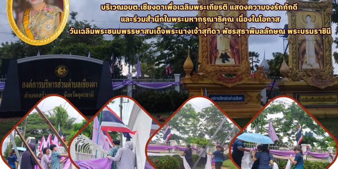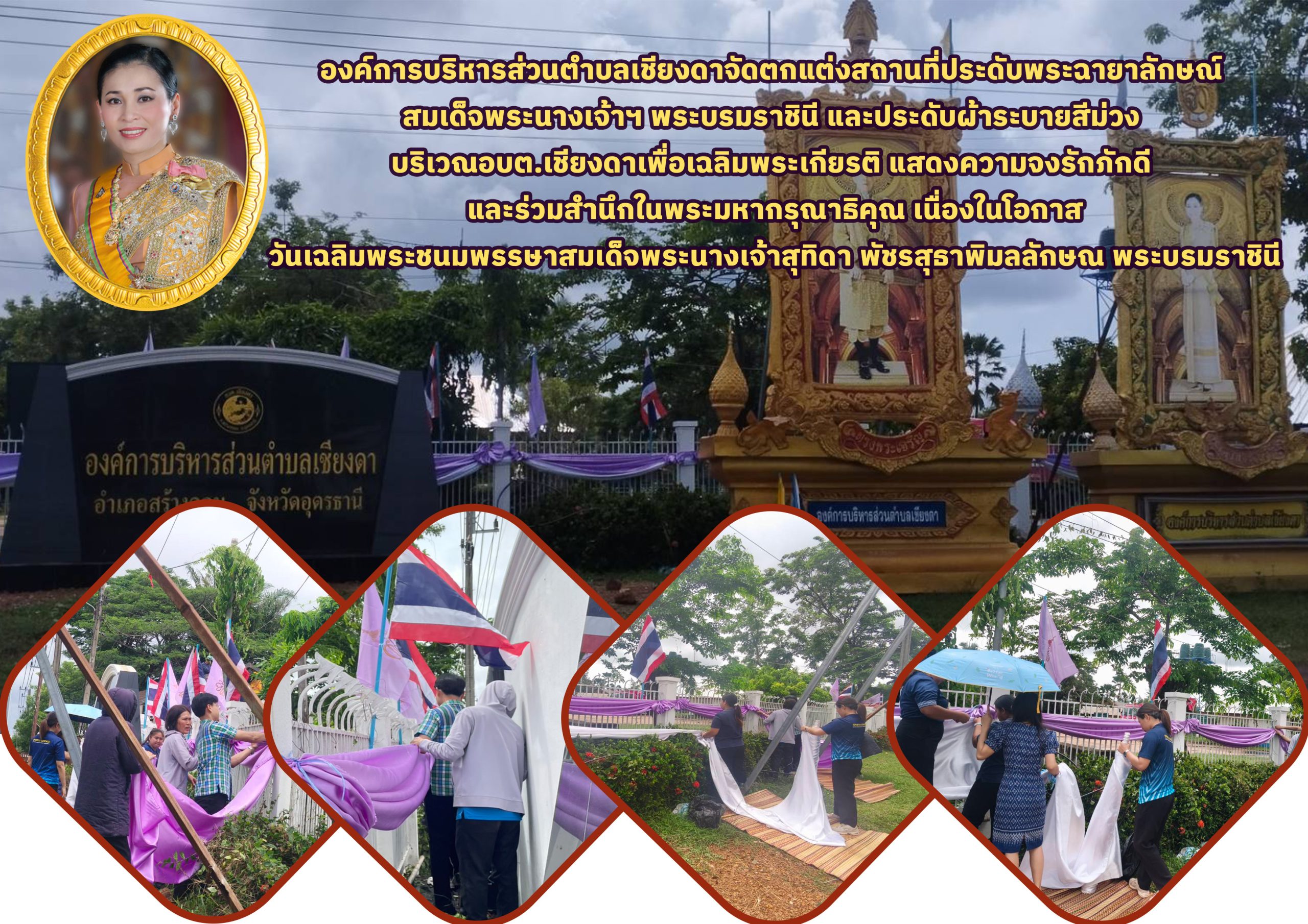 Posted in กิจกรรมและโครงการต่างๆ วันที่ 30 พฤษภาคม 2568 องค์การบริหารส่วนตำบลเชียงดาจัดตกแต่งสถานที่ประดับพระฉายาลักษณ์ สมเด็จพระนางเจ้าฯ พระบรมราชินี และประดับผ้าระบายสีม่วง บริเวณอบต.เชียงดาเพื่อเฉลิมพระเกียรติ แสดงความจงรักภักดี และร่วมสำนึกในพระมหากรุณาธิคุณ เนื่องในโอกาสวันเฉลิมพระชนมพรรษาสมเด็จพระนางเจ้าสุทิดา พัชรสุธาพิมลลักษณ พระบรมราชินี Admin
