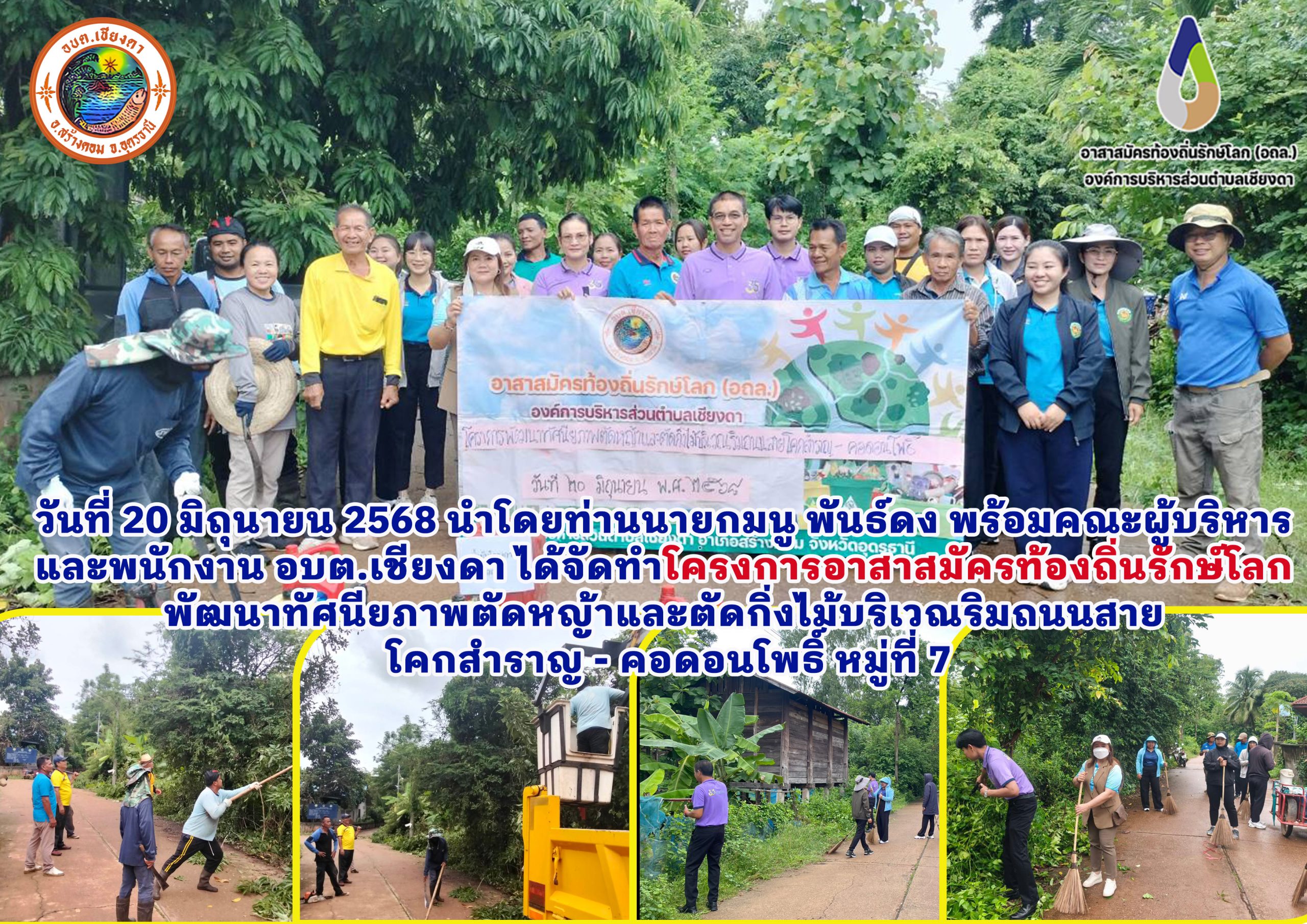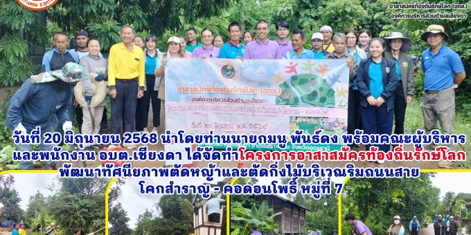 Posted in กิจกรรมและโครงการต่างๆ วันที่ 20 มิถุนายน 2568 นำโดยท่านนายกมนู พันธ์ดง พร้อมคณะผู้บริหาร และพนักงาน อบต.เชียงดา ได้จัดทำโครงการอาสาสมัครท้องถิ่นรักษ์โลก พัฒนาทัศนียภาพตัดหญ้าและตัดกิ่งไม้บริเวณริมถนนสาย โคกสำราญ – คอดอนโพธิ์ หมู่ที่ 7 Admin