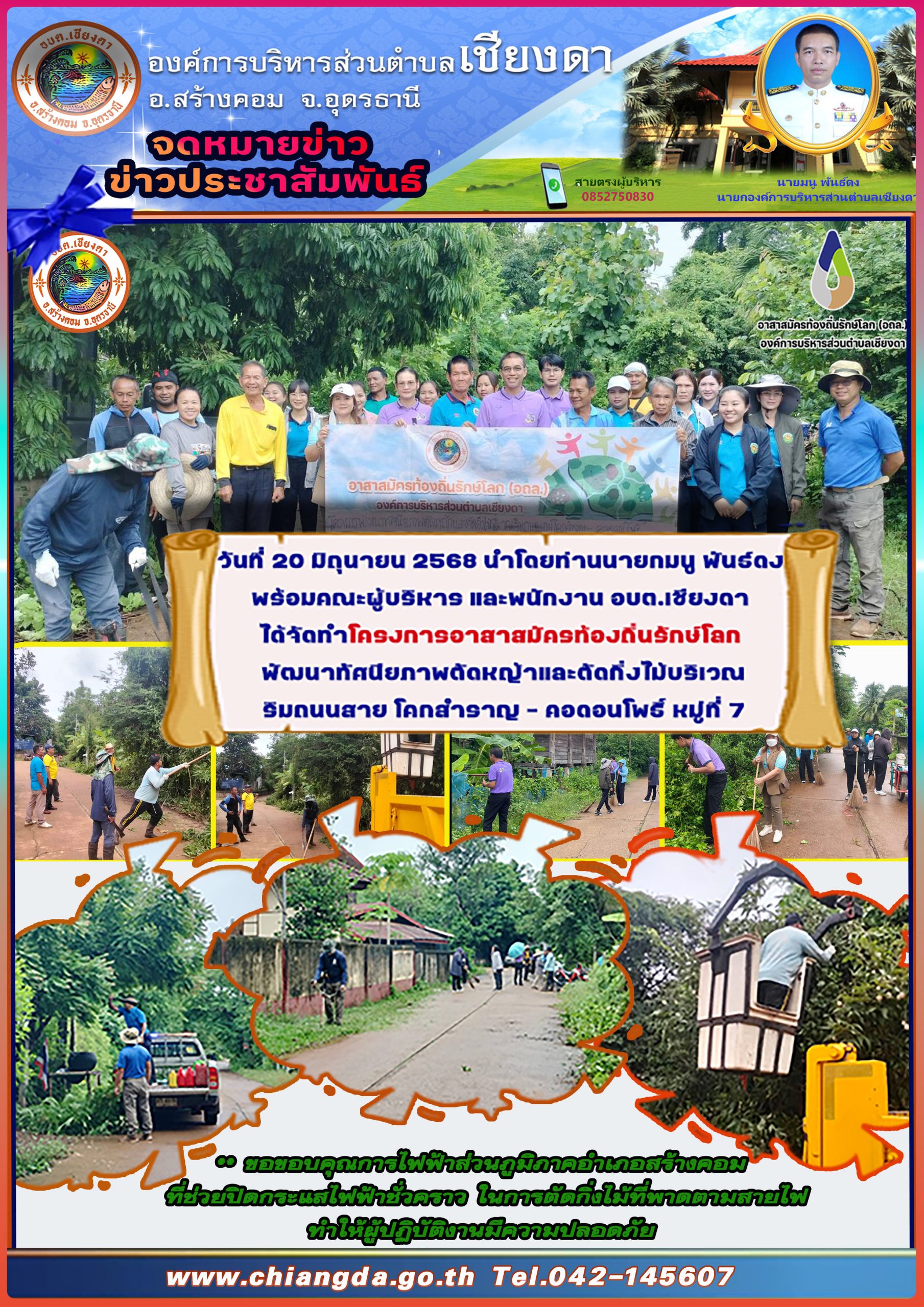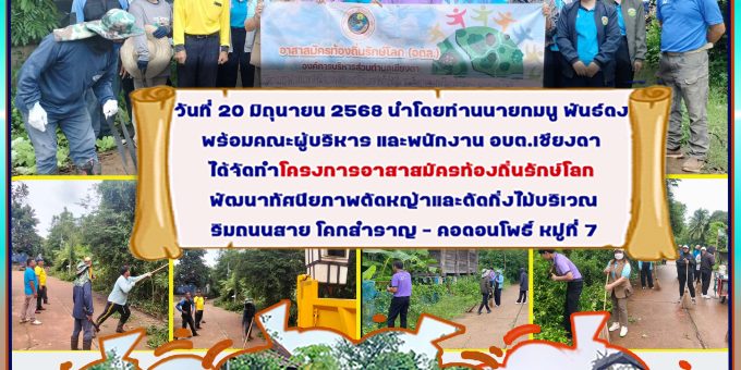Posted in จดหมายข่าวประชาสัมพันธ์ วันที่ 20 มิถุนายน 2568 นำโดยท่านนายกมนู พันธ์ดง พร้อมคณะผู้บริหาร และพนักงาน อบต.เชียงดา ได้จัดทำโครงการอาสาสมัครท้องถิ่นรักษ์โลก พัฒนาทัศนียภาพตัดหญ้าและตัดกิ่งไม้บริเวณริมถนนสาย โคกสำราญ – คอดอนโพธิ์ หมู่ที่ 7 Admin