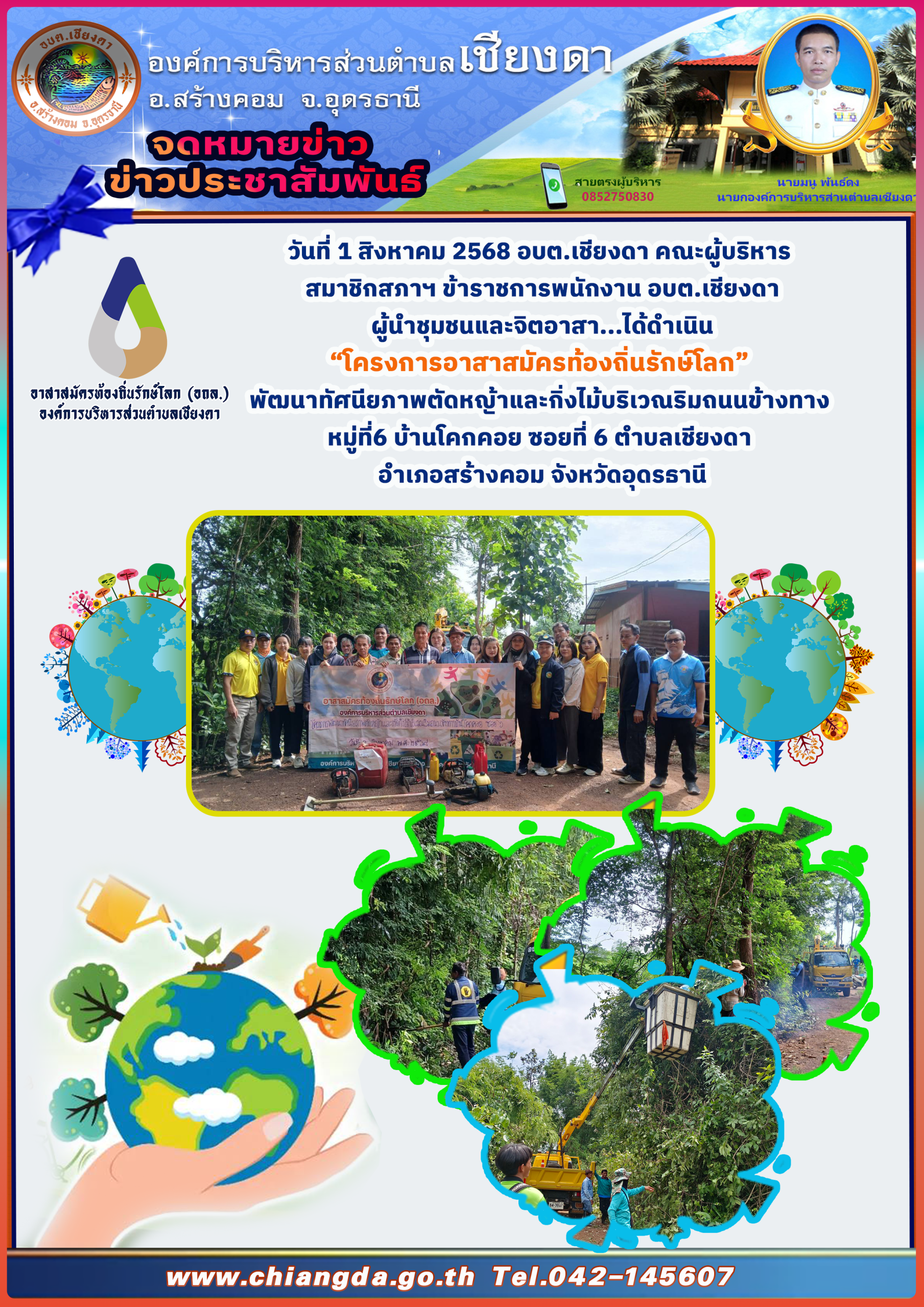 Posted in จดหมายข่าวประชาสัมพันธ์ วันที่ 1 สิงหาคม 2568 อบต.เชียงดา ได้ดำเนิน“โครงการอาสาสมัครท้องถิ่นรักษ์โลก”พัฒนาทัศนียภาพตัดหญ้าและกิ่งไม้บริเวณริมถนนข้างทาง หมู่ที่6 บ้านโคกคอย ซอยที่ 6 ตำบลเชียงดา อำเภอสร้างคอม จังหวัดอุดรธานี Admin
