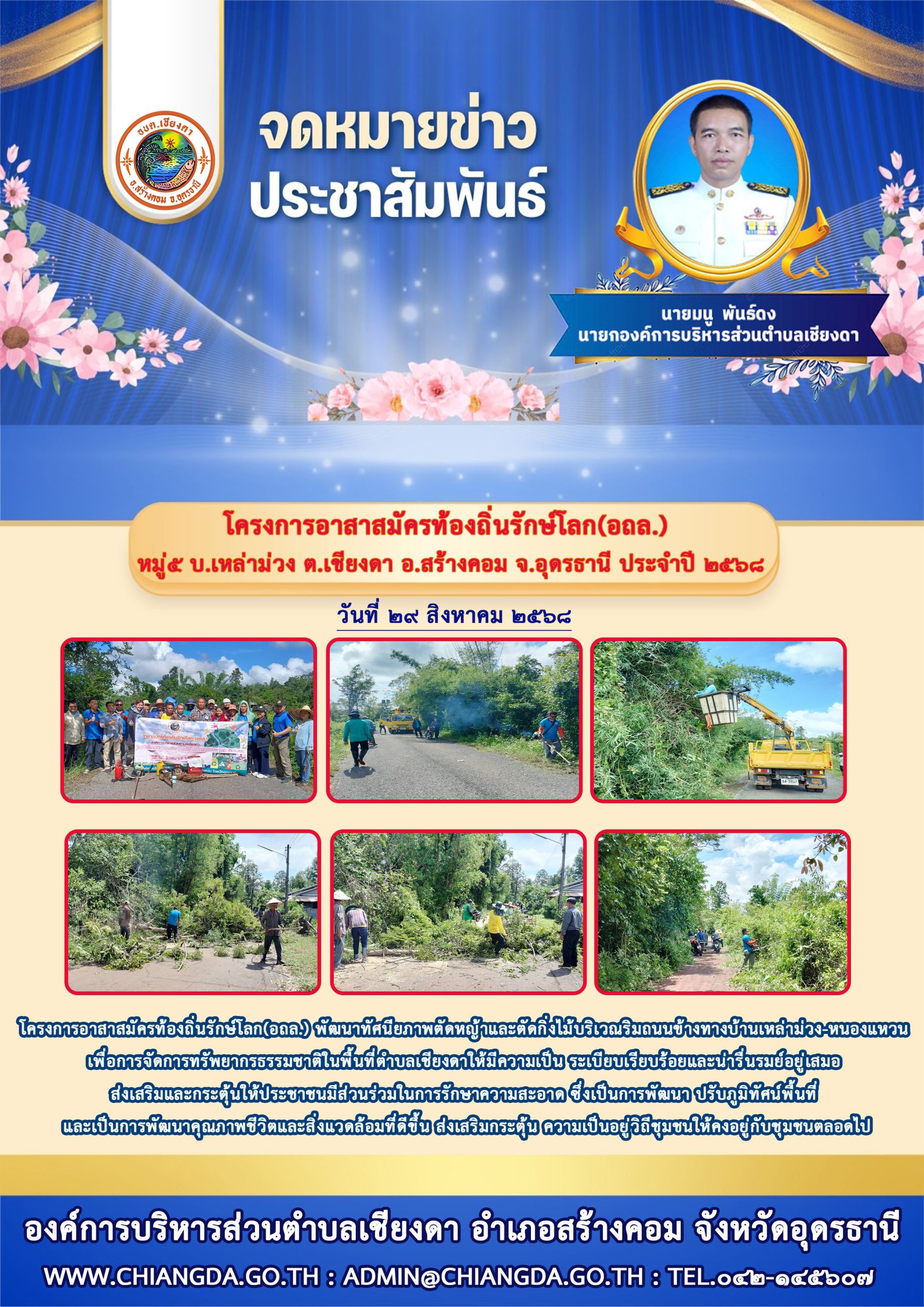Posted in จดหมายข่าวประชาสัมพันธ์ วันที่ 29 สิงหาคม 2568 อบต.เชียงดา คณะผู้บริหาร สมาชิกสภาฯ ข้าราชการพนักงาน อบต.เชียงดา ผู้นำชุมชนและจิตอาสาได้ดำเนินโครงการอาสาสมัครท้องถิ่นรักษ์โลก(อถล.) พัฒนาทัศนียภาพตัดหญ้าและตัดกิ่งไม้บริเวณริมถนนข้างทางบ้านเหล่าม่วง-หนองแหวน หมู่5 บ้านเหล่าม่วง Admin