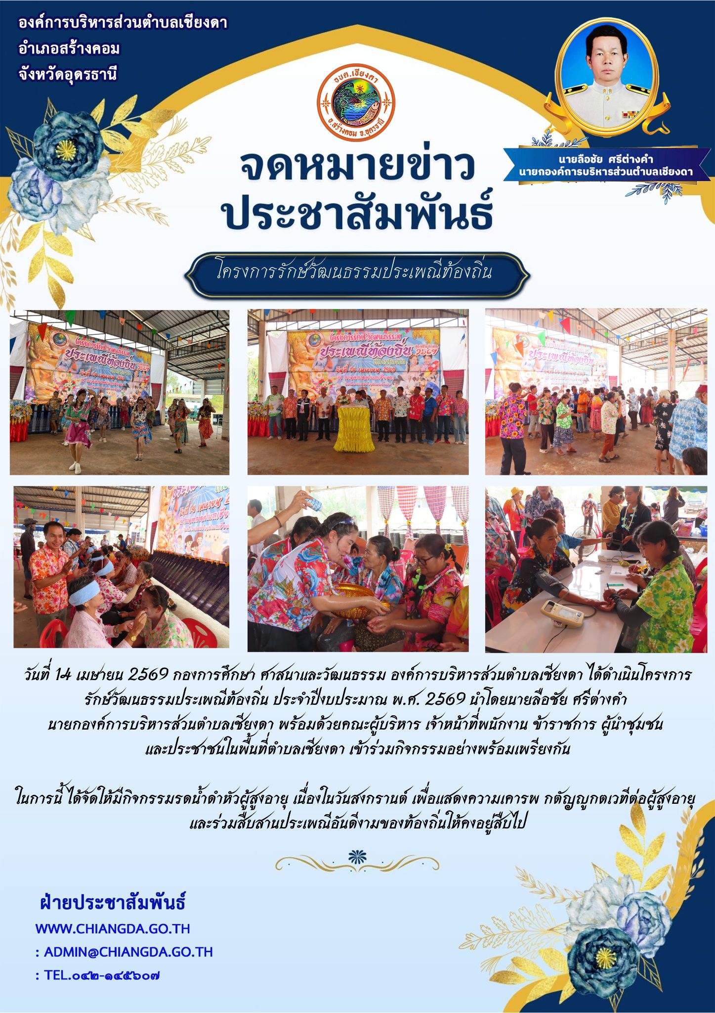 Posted in จดหมายข่าวประชาสัมพันธ์ วันที่ 14 เมษายน 2569 กองการศึกษา ศาสนาและวัฒนธรรม องค์การบริหารส่วนตำบลเชียงดา ได้ดำเนินโครงการรักษ์วัฒนธรรมประเพณีท้องถิ่น ประจำปีงบประมาณ พ.ศ. 2569 นำโดยนายลือชัย ศรีต่างคำ นายกองค์การบริหารส่วนตำบลเชียงดา พร้อมด้วยคณะผู้บริหาร เจ้าหน้าที่พนักงาน ข้าราชการ ผู้นำชุมชน และประชาชนในพื้นที่ตำบลเชียงดา เข้าร่วมกิจกรรมอย่างพร้อมเพรียงกัน Admin