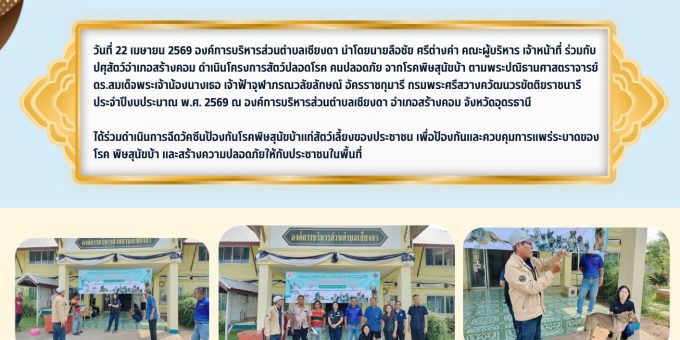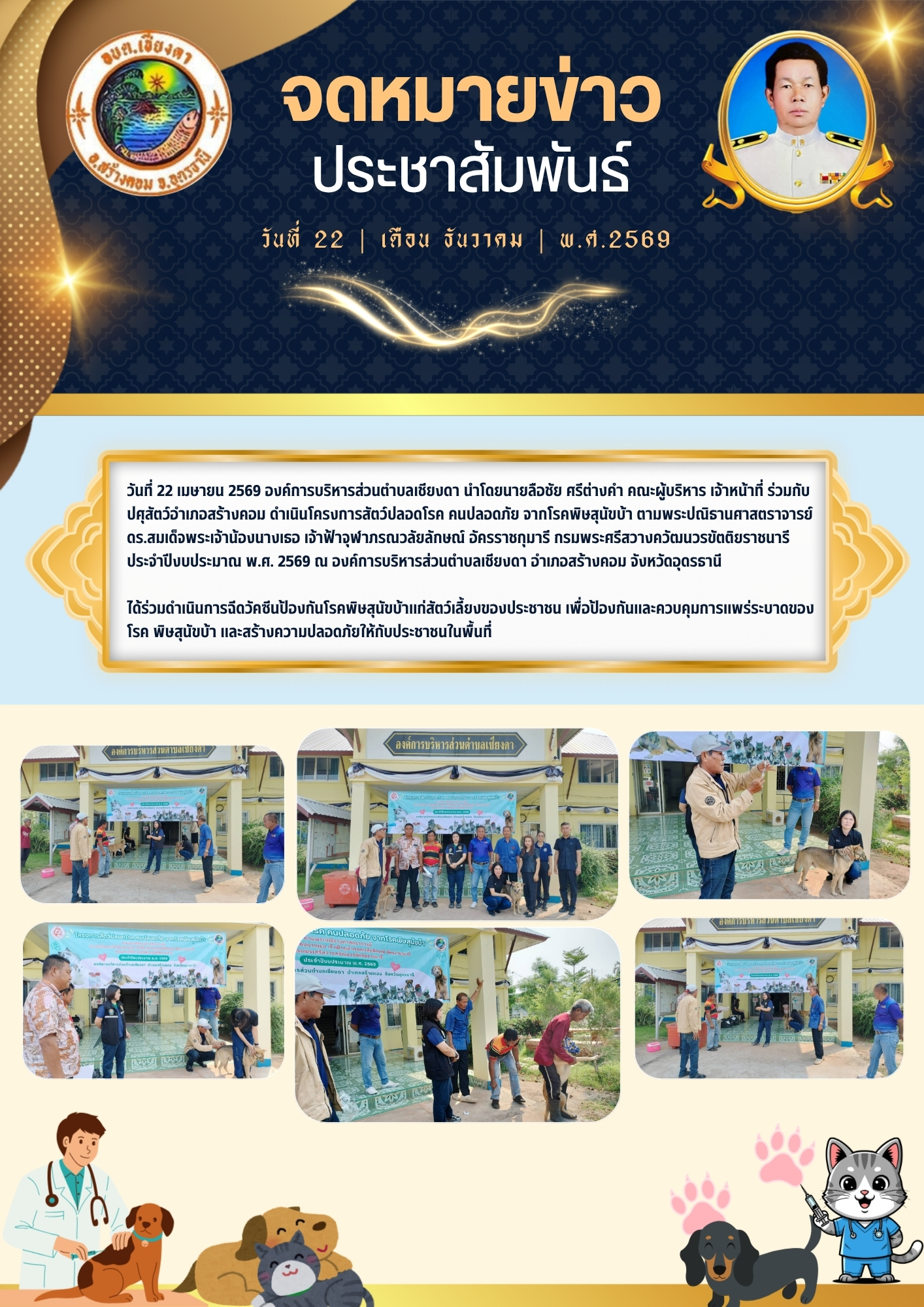 Posted in จดหมายข่าวประชาสัมพันธ์ วันที่ 22 เมษายน 2569 องค์การบริหารส่วนตำบลเชียงดา นำโดยนายลือชัย ศรีต่างคำ คณะผู้บริหาร เจ้าหน้าที่ ร่วมกับปศุสัตว์อำเภอสร้างคอม ดำเนินโครงการสัตว์ปลอดโรค คนปลอดภัย จากโรคพิษสุนัขบ้า ตามพระปณิธานศาสตราจารย์ ดร.สมเด็จพระเจ้าน้องนางเธอ เจ้าฟ้าจุฬาภรณวลัยลักษณ์ อัครราชกุมารี กรมพระศรีสวางควัฒนวรขัตติยราชนารี ประจำปีงบประมาณ พ.ศ. 2569 ณ องค์การบริหารส่วนตำบลเชียงดา อำเภอสร้างคอม จังหวัดอุดรธานี Admin