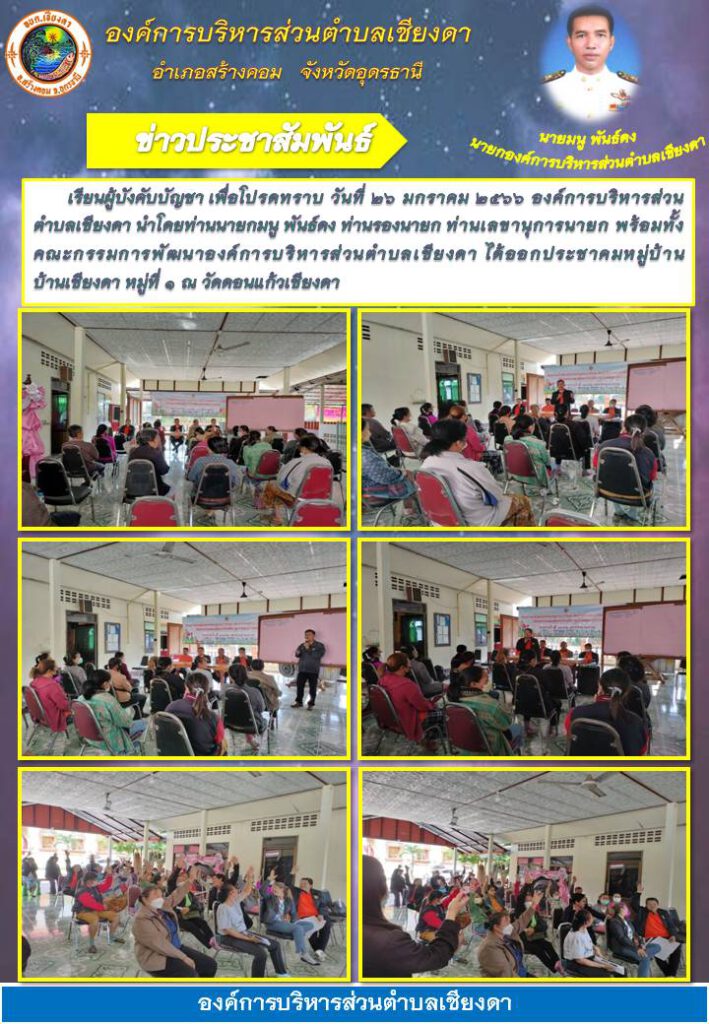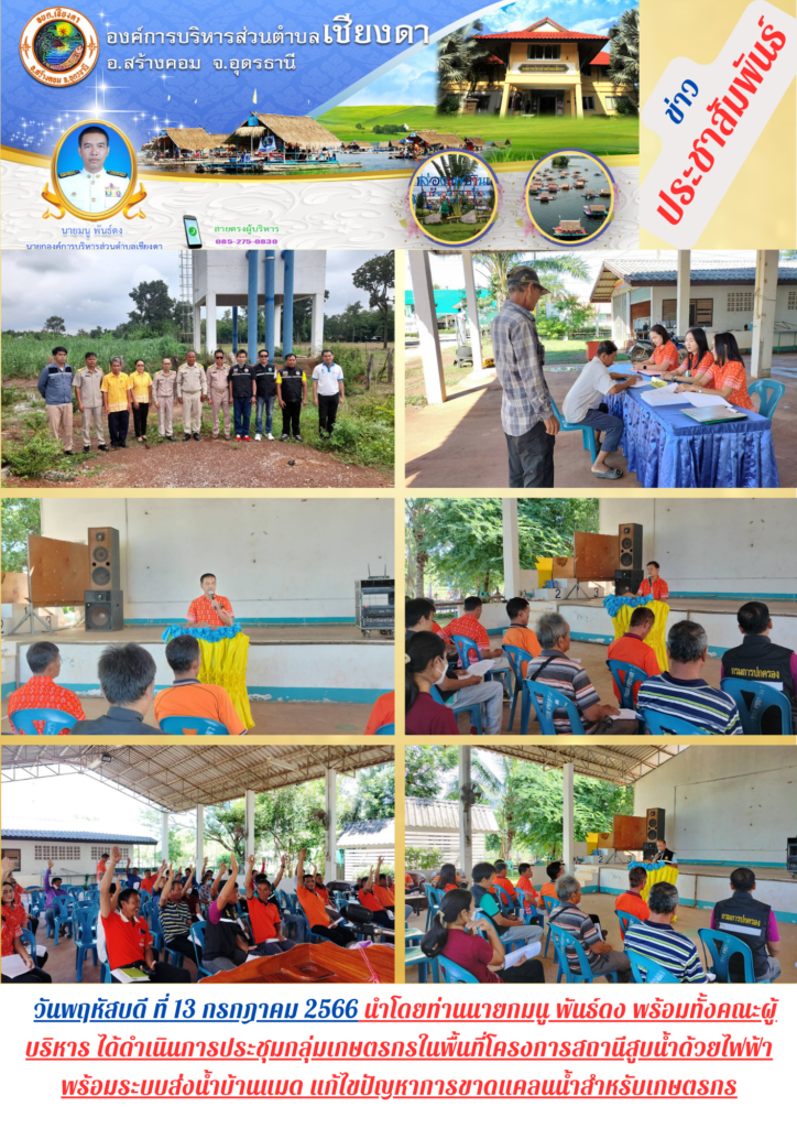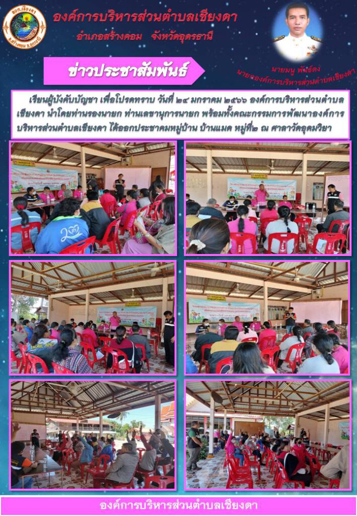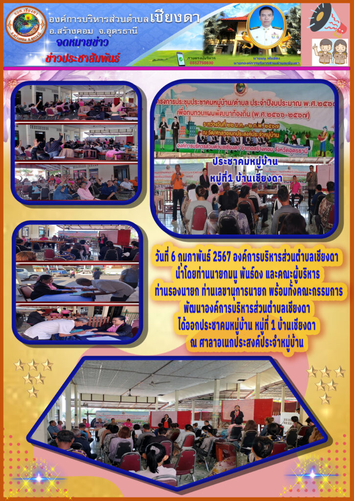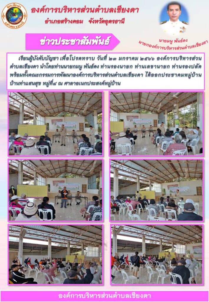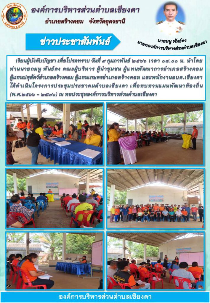วันที่ 9 กุมภาพันธ์ 2566 เวลา 08.00 น. นำโดยท่านนายกมนู พันธ์ดง คณะผู้บริหาร ผู้นำชุมชน ผู้แทนพัฒนาการอำเภอสร้างคอม ผู้แทนปศุสัตว์อำเภอสร้างคอม ผู้แทนเกษตรอำเภอสร้างคอม และพนักงานอบต.เชียงดา ได้ดำเนินโครงการประชุมประชาคมตำบลเชียงดา เพื่อทบทวนแผนพัฒนาท้องถิ่น(พ.ศ.2566 – 2570) ณ หอประชุมองค์การบริหารส่วนตำบลเชียงดา