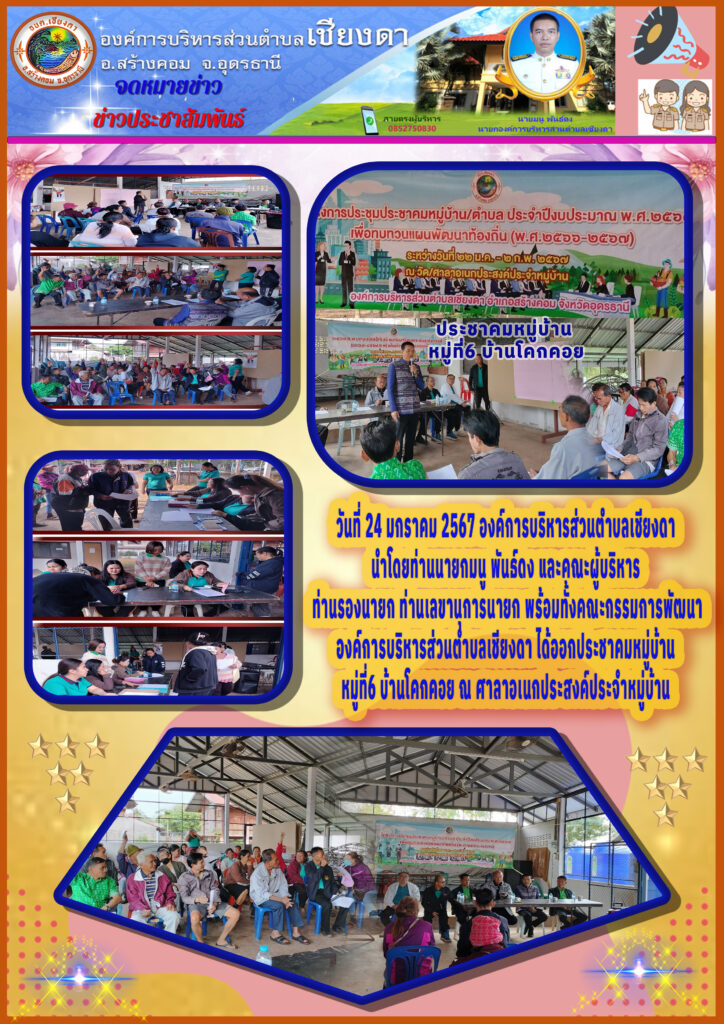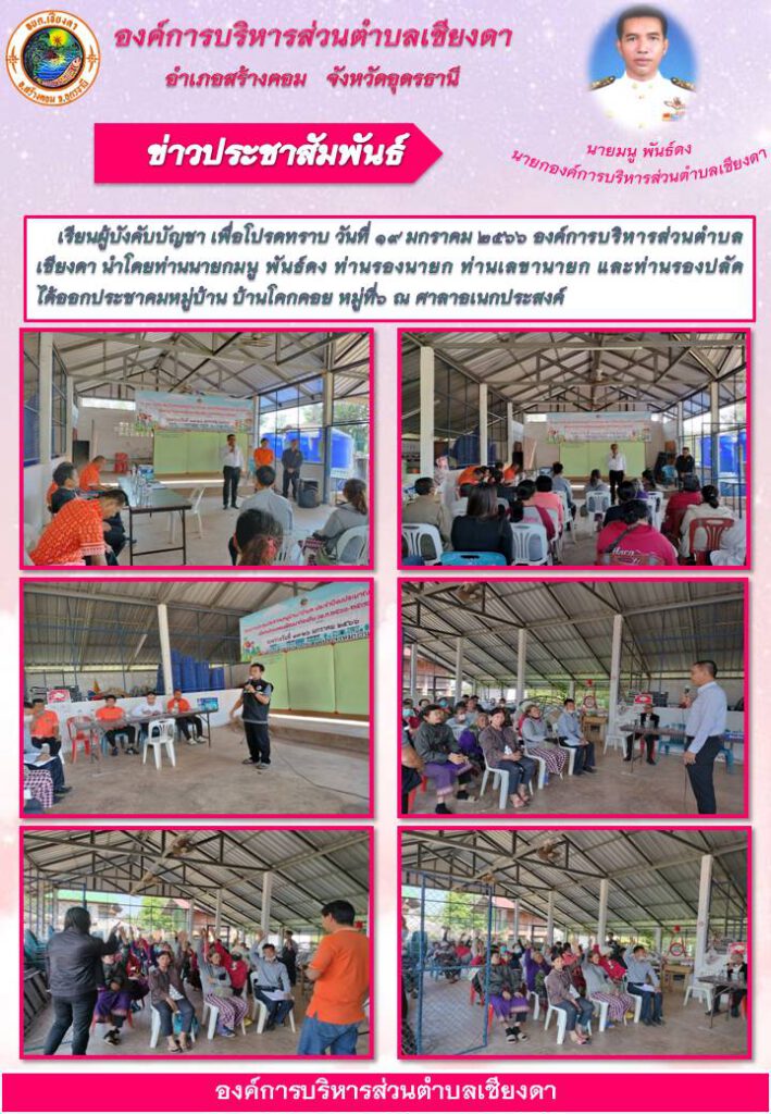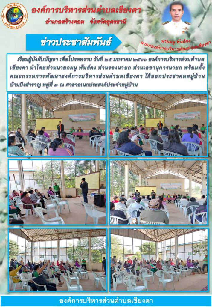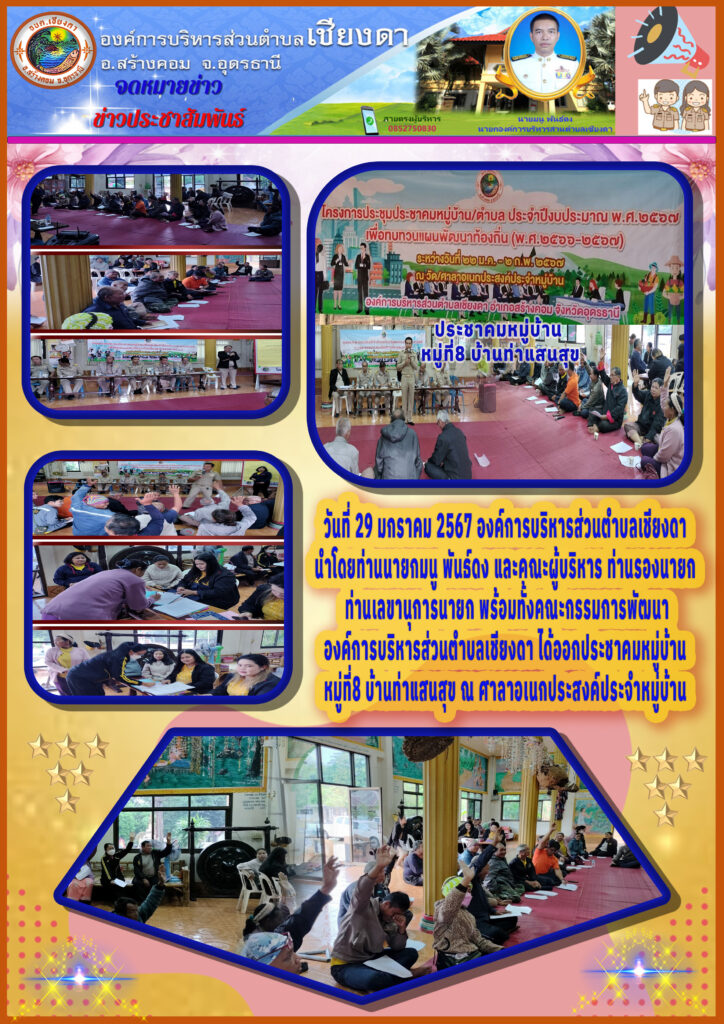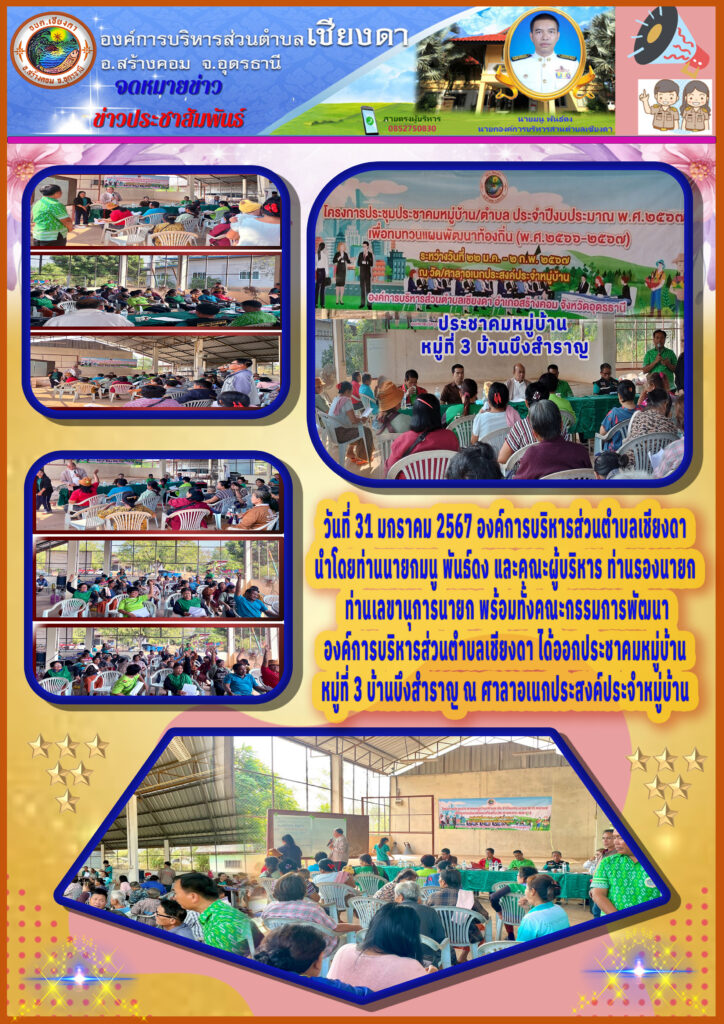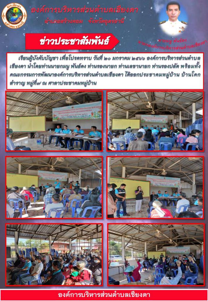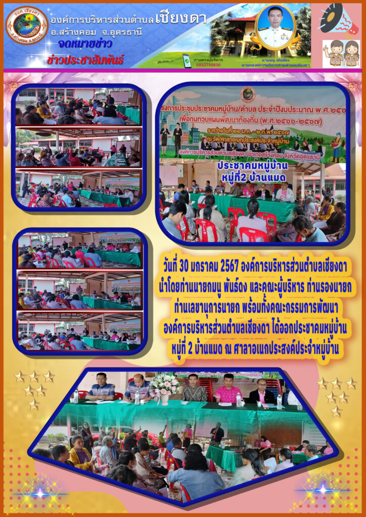 วันที่ 9 กุมภาพันธ์ 2566 เวลา 08.00 น. นำโดยท่านนายกมนู พันธ์ดง คณะผู้บริหาร ผู้นำชุมชน ผู้แทนพัฒนาการอำเภอสร้างคอม ผู้แทนปศุสัตว์อำเภอสร้างคอม ผู้แทนเกษตรอำเภอสร้างคอม และพนักงานอบต.เชียงดา ได้ดำเนินโครงการประชุมประชาคมตำบลเชียงดา เพื่อทบทวนแผนพัฒนาท้องถิ่น(พ.ศ.2566 – 2570) ณ หอประชุมองค์การบริหารส่วนตำบลเชียงดา