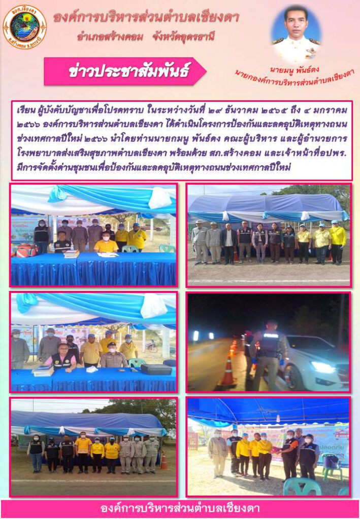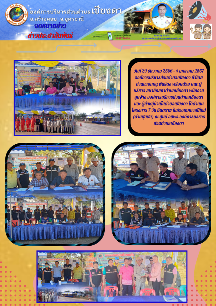 วันที่ 29 ธันวาคม 2566 – 4 มกราคม 2567 องค์การบริหารส่วนตำบลเชียงดา นำโดยท่านนายกมนู พันธ์ดง พร้อมด้วย คณะผู้บริหาร สมาชิกสภาตำบลเชียงดา พนักงาน ลูกจ้าง องค์การบริหารส่วนตำบลเชียงดาและ ผู้นำหมู่บ้านในตำบลเชียงดา ได้ดำเนินโครงการ 7 วัน อันตราย ในช่วงเทศกาลปีใหม่ (ด่านชุมชน) ณ ศูนย์ อปพร.องค์การบริหารส่วนตำบลเชียงดา