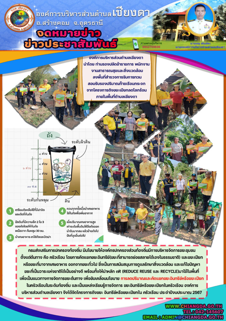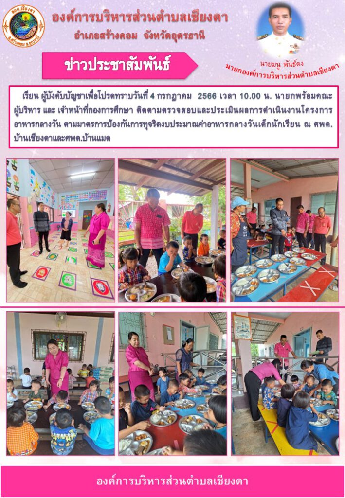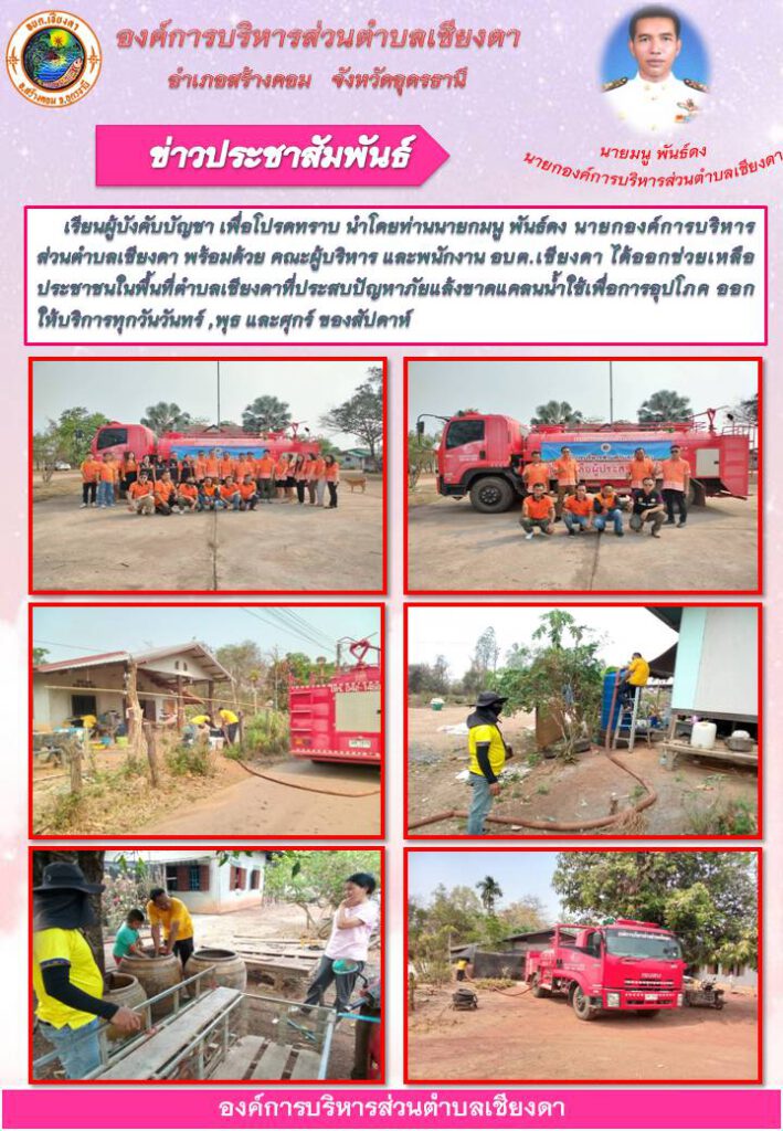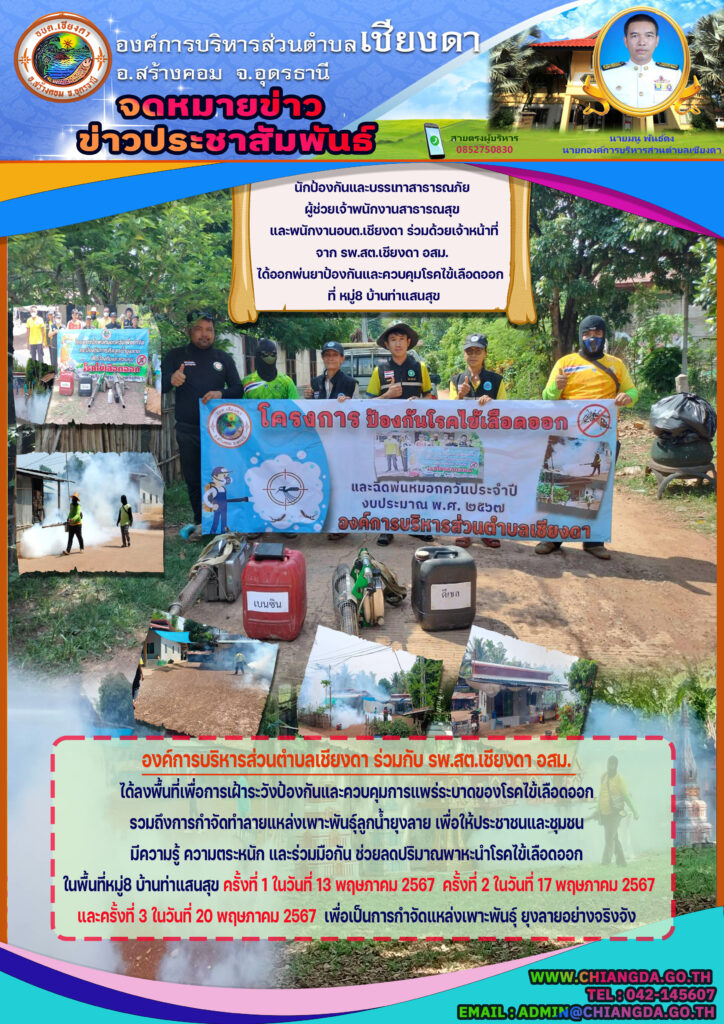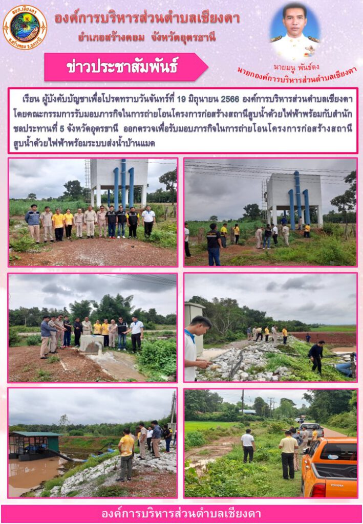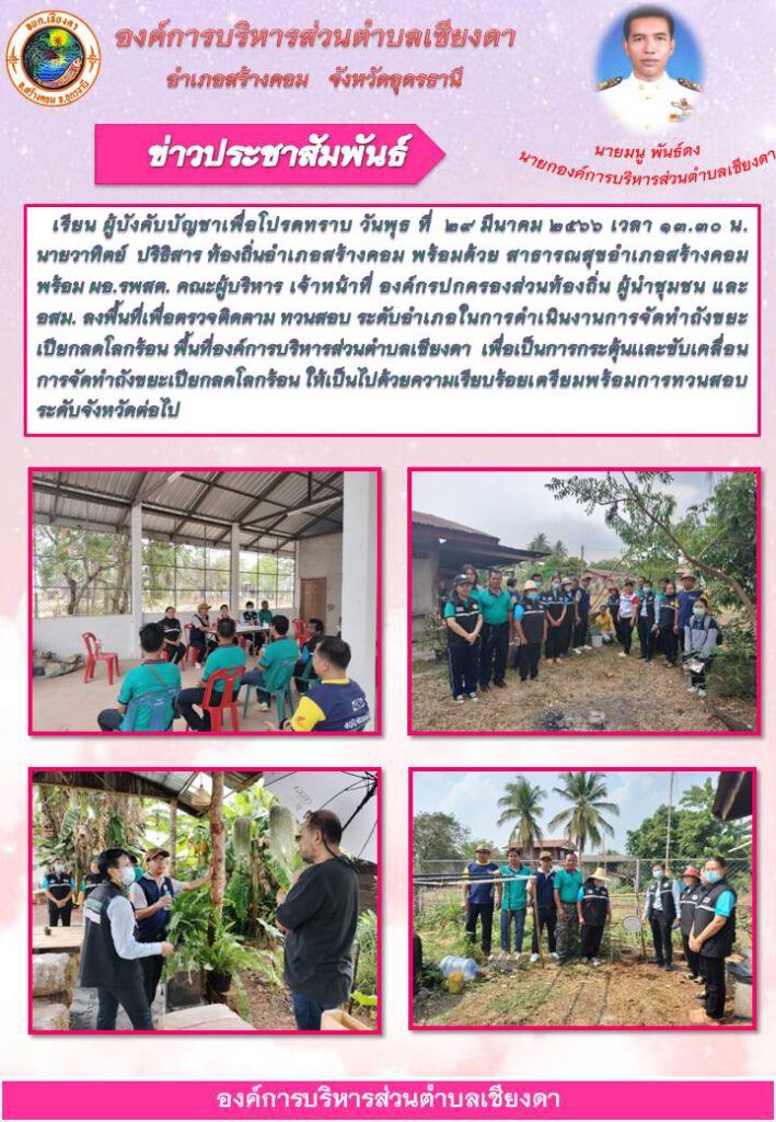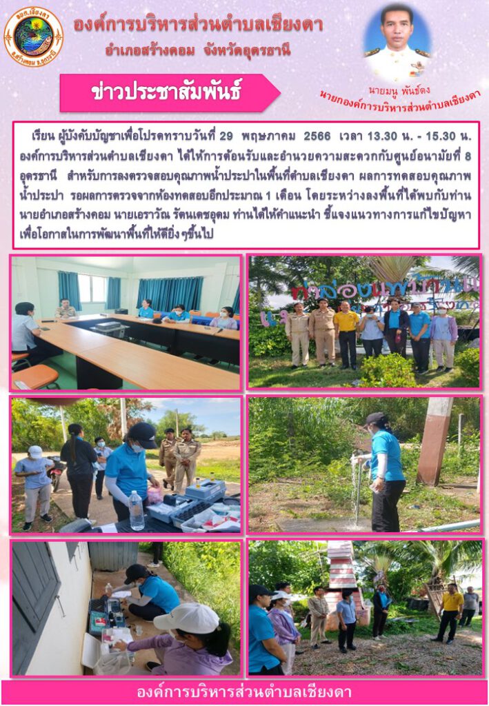 วันที่ 29 พฤษภาคม 2566 เวลา 13.30 น. – 15.30 น. องค์การบริหารส่วนตำบลเชียงดา ได้ให้การต้อนรับและอำนวยความสะดวกกับศูนย์อนามัยที่ 8 อุดรธานี สำหรับการลงตรวจสอบคุณภาพน้ำประปาในพื้นที่ตำบลเชียงดา ผลการทดสอบคุณภาพน้ำประปา รอผลการตรวจจากห้องทดสอบอีกประมาณ 1 เดือน โดยระหว่างลงพื้นที่ได้พบกับท่านนายอำเภอสร้างคอม นายเอราวัณ รัตนเดชอุดม ท่านได้ให้คำแนะนำ ชี้แจงแนวทางการแก้ไขปัญหาเพื่อโอกาสในการพัฒนาพื้นที่ให้ดียิ่งๆขึ้นไป