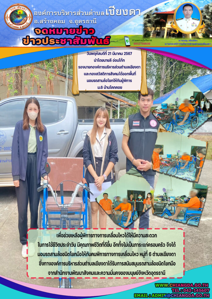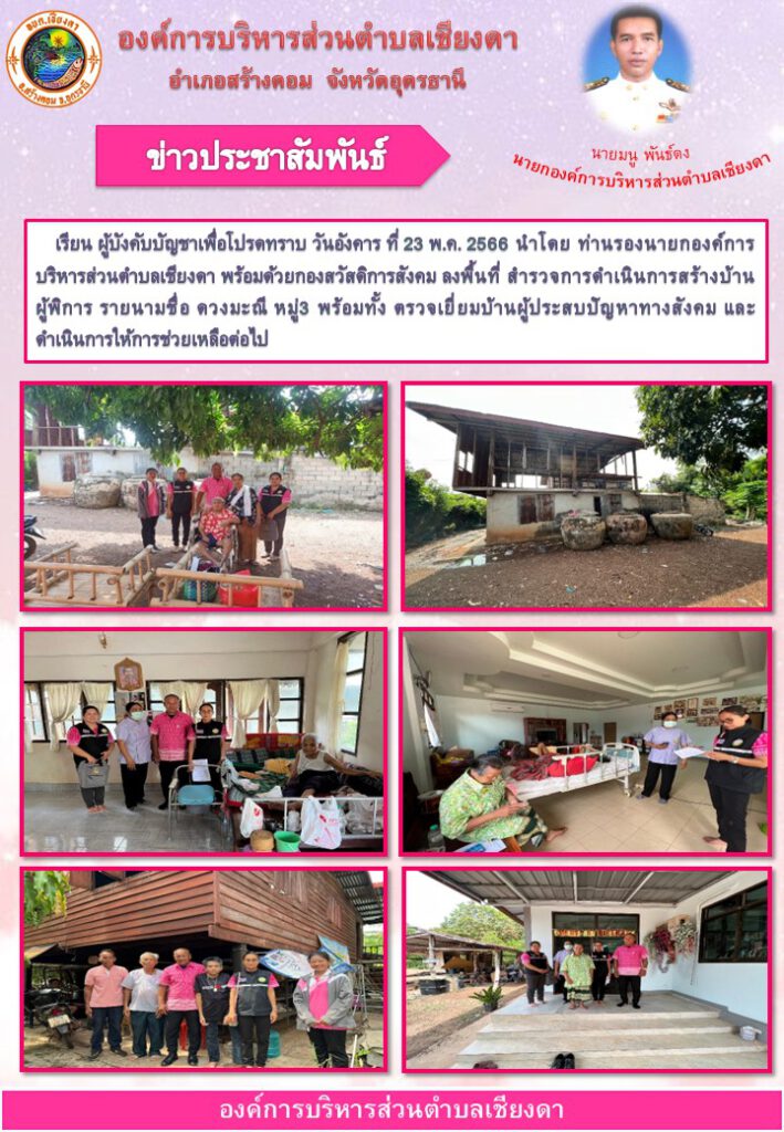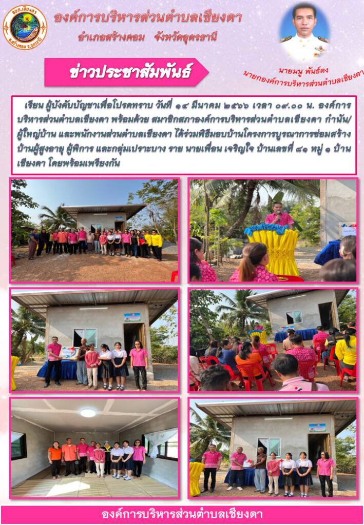 วันที่ 14 มีนาคม 2566 เวลา 09.00 น. องค์การบริหารส่วนตำบลเชียงดา พร้อมด้วย สมาชิกสภาองค์การบริหารส่วนตำบลเชียงดา กำนัน/ผู้ใหญ่บ้าน และพนักงานส่วนตำบลเชียงดา ได้ร่วมพิธีมอบบ้านโครงการบูรณาการซ่อมสร้างบ้านผู้สูงอายุ ผู้พิการ และกลุ่มเปราะบาง ราย นายเพื่อน เจริญใจ บ้านเลขที่ 81 หมู่ 1 บ้านเชียงดา โดยพร้อมเพรียงกัน
