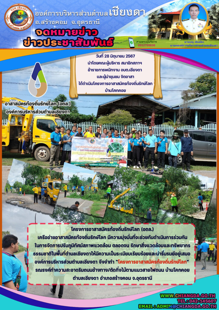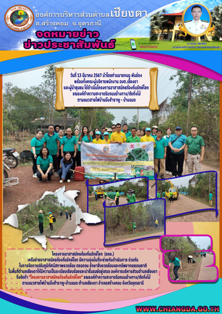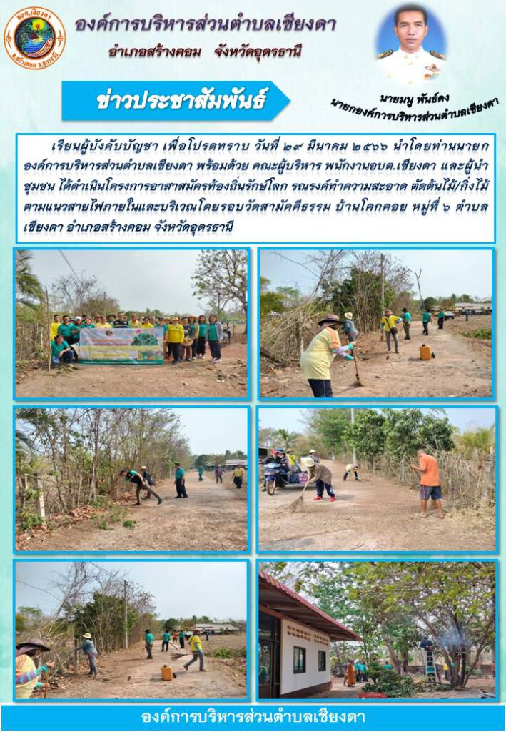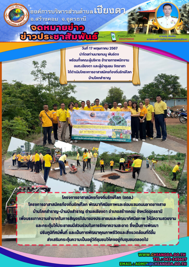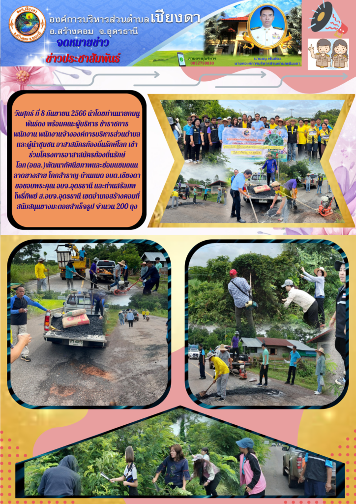 วันศุกร์ ที่ 8 กันยายน 2566 นำโดยท่านนายกมนู พันธ์ดง พร้อมคณะผู้บริหาร ข้าราชการ พนักงาน พนักงานจ้างองค์การบริหารส่วนตำบลและผู้นำชุมชน อาสาสมัครท้องถิ่นรักษ์โลก เข้าร่วมโครงการอาสาสมัครท้องถิ่นรักษ์โลก(อถล.)พัฒนาทัศนียภาพและซ่อมแซมถนนลาดยางสาย โคกสำราญ-บ้านแมด อบต.เขียงดา ขอขอบพระคุณ อบจ.อุดรธานี และท่านสรัลภพ โพธิ์ทิพย์ ส.อบจ.อุดรธานี เขตอำเภอสร้างคอมที่สนับสนุนยางมะตอยสำเร็จรูป จำนวน 200 ถุง