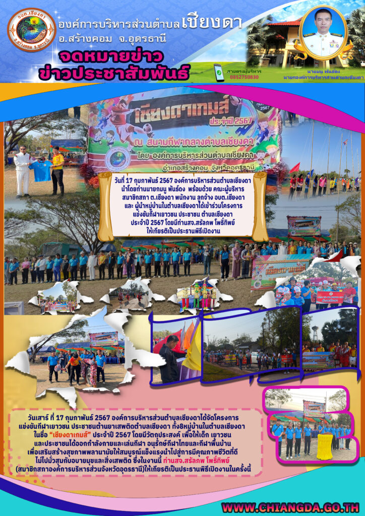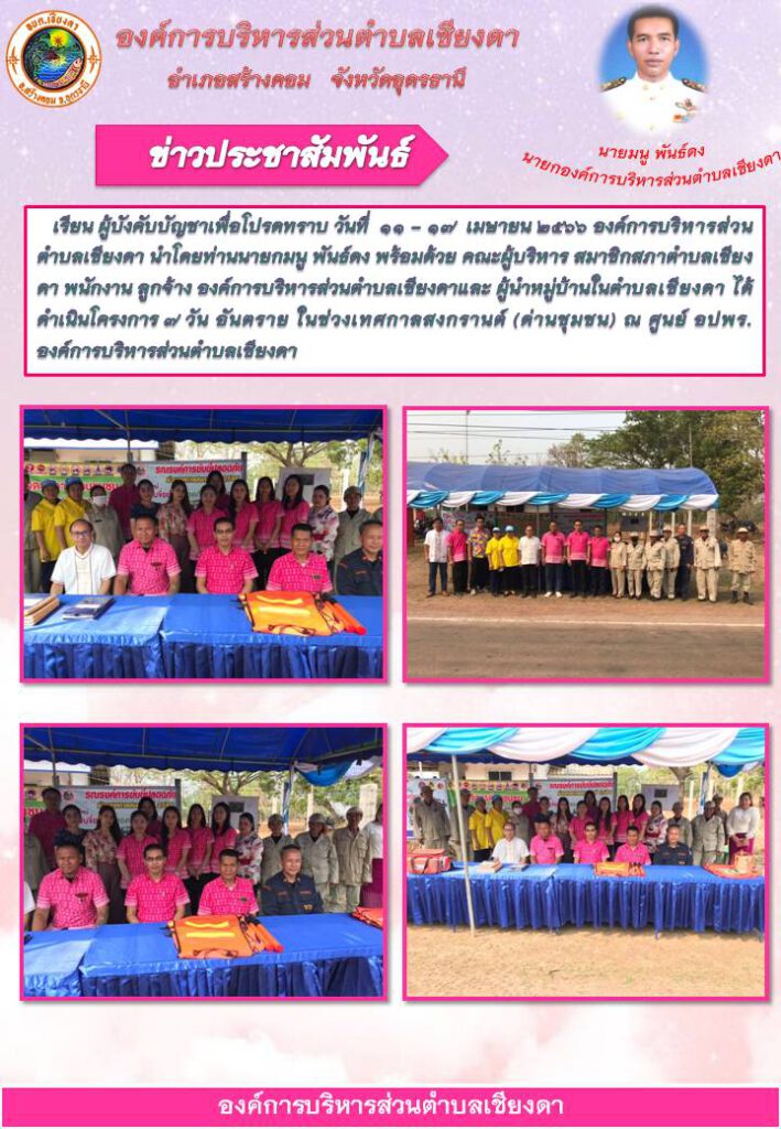 วันที่ 11 – 17 เมษายน 2566 องค์การบริหารส่วนตำบลเชียงดา นำโดยท่านนายกมนู พันธ์ดง พร้อมด้วย คณะผู้บริหาร สมาชิกสภาตำบลเชียงดา พนักงาน ลูกจ้าง องค์การบริหารส่วนตำบลเชียงดาและ ผู้นำหมู่บ้านในตำบลเชียงดา ได้ดำเนินโครงการ 7 วัน อันตราย ในช่วงเทศกาลสงกรานต์ (ด่านชุมชน) ณ ศูนย์ อปพร.องค์การบริหารส่วนตำบลเชียงดา