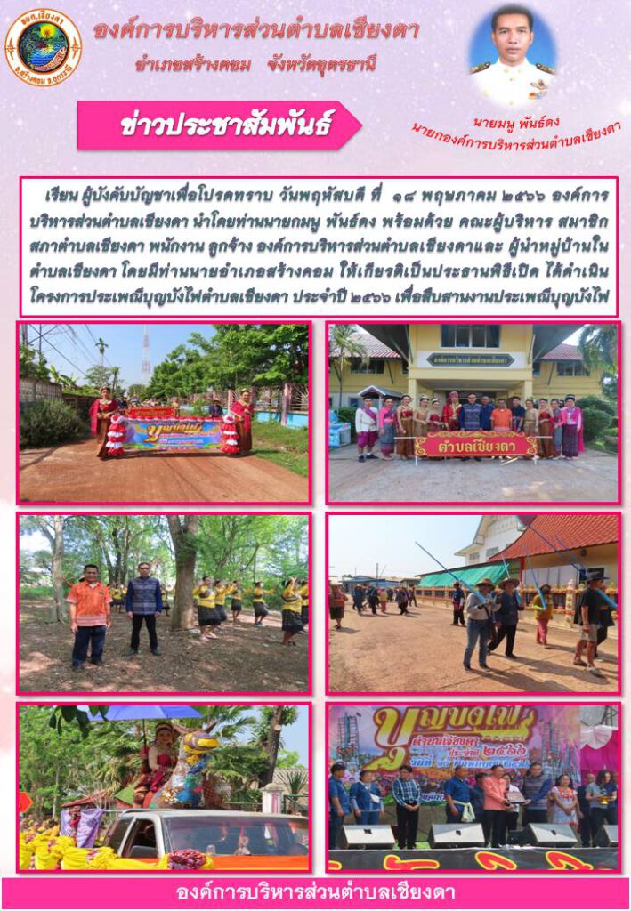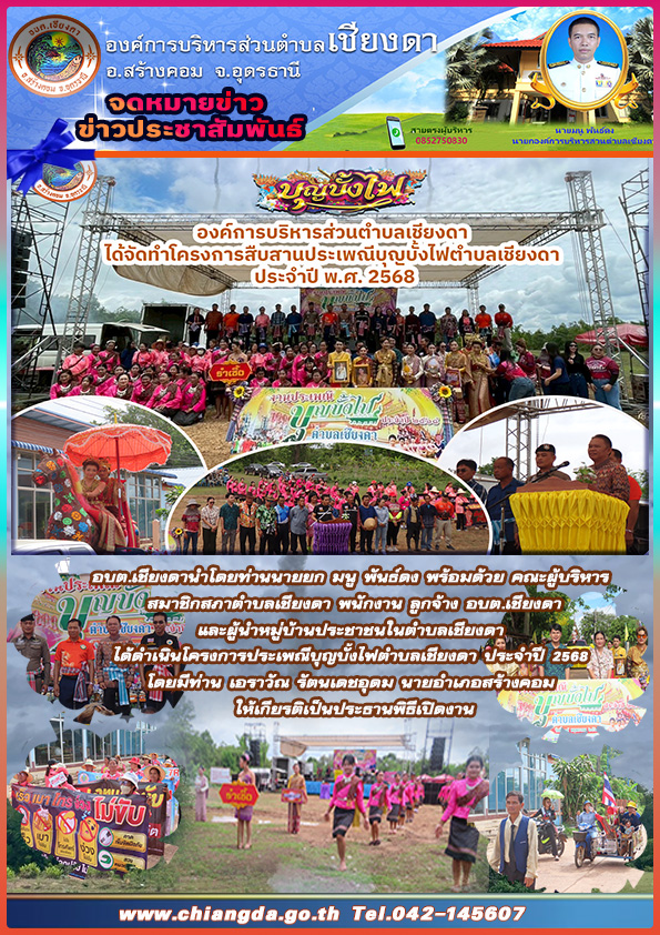 วันที่ 15 พฤษภาคม 2568 องค์การบริหารส่วนตำบลเชียงดานำโดยท่านนายยก มนู พันธ์ดง พร้อมด้วย คณะผู้บริหาร สมาชิกสภาตำบลเชียงดา พนักงาน ลูกจ้าง องค์การบริหารส่วนตำบลเชียงดาและผู้นำหมู่บ้านในตำบลเชียงดา ได้ดำเนินโครงการประเพณีบุญบั้งไฟตำบลเชียงดา ประจำปี 2568 โดยมีท่าน เอราวัณ รัตนเดชอุดม นายอำเภอสร้างคอม ให้เกียรติเป็นประธานพิธีเปิดงาน